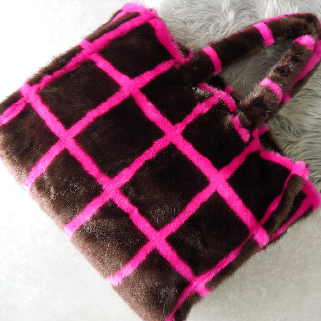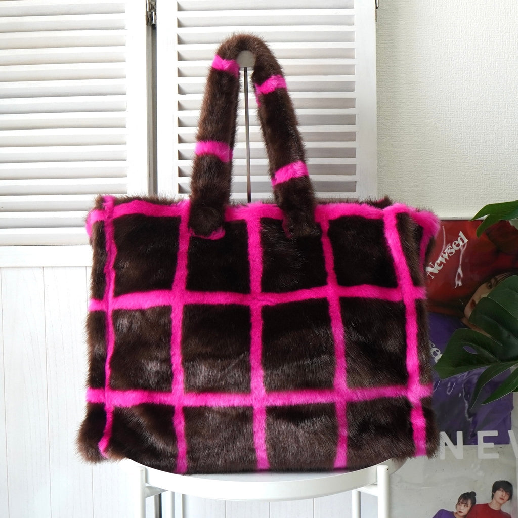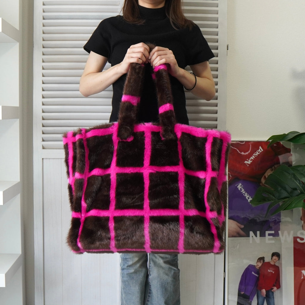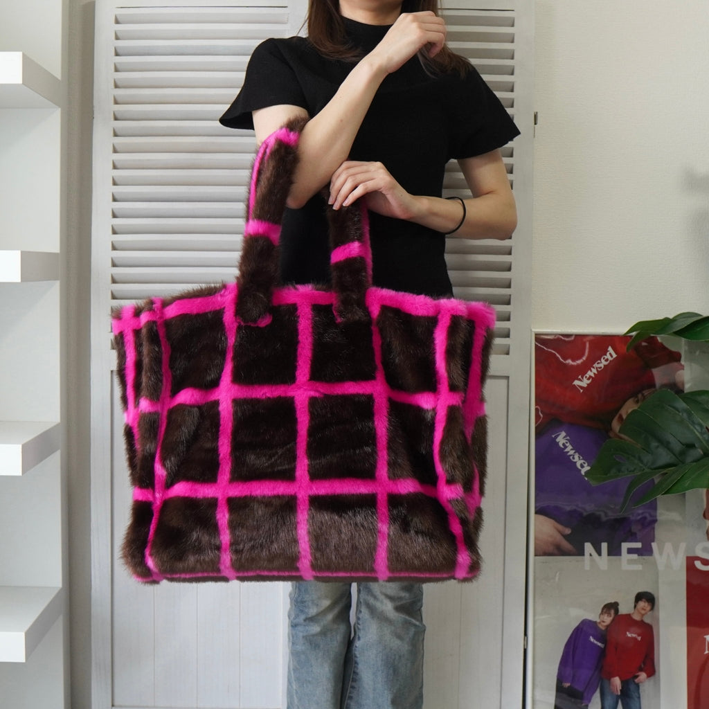 スタンド スタジオ 格子柄 ファー トートバッグ ハンドバッグ ブラウン / ピンク